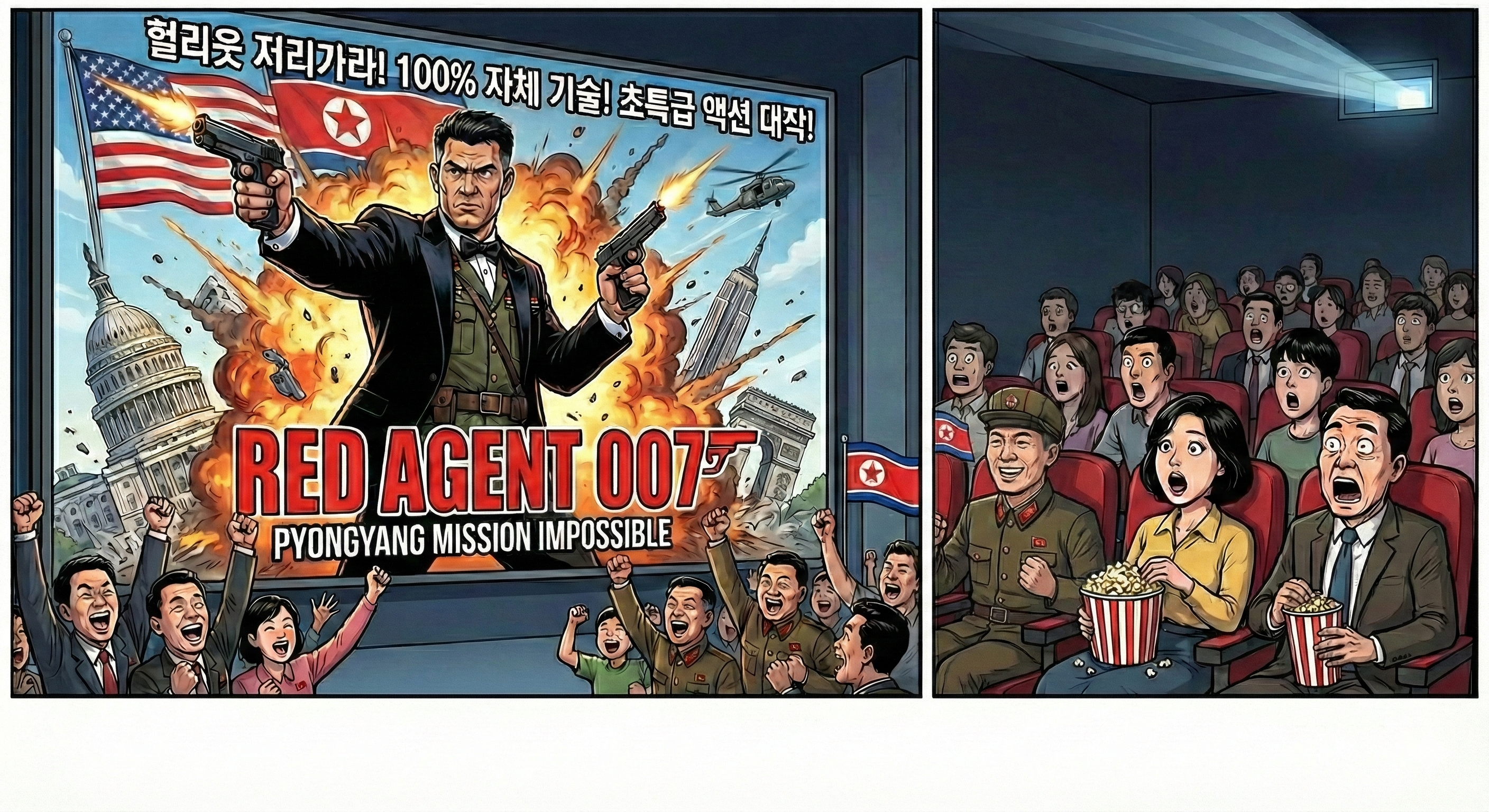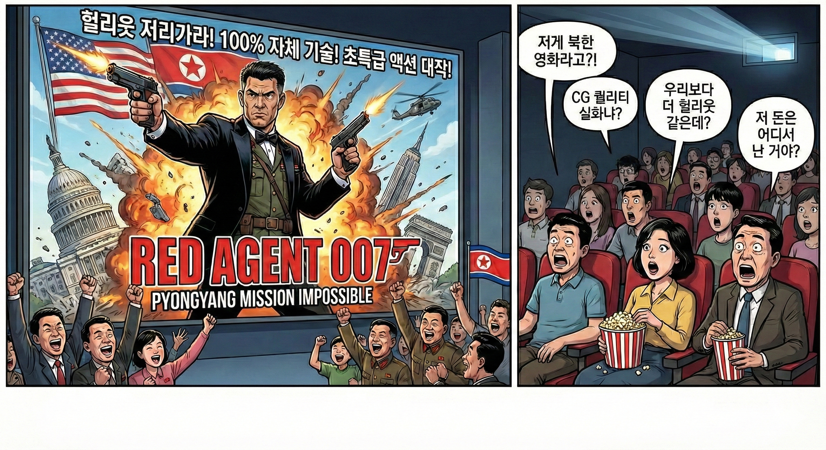 북한에서 최고 지도자 암살 시도를 정면으로 다룬 첩보영화가 등장해 전국 극장을 가득 채우고 있다. 할리우드식 액션 연출과 파격적인 소재로 기존 수령 찬양 영화와는 완전히 다른 분위기를 자아내며, 마치 한국의 드라마 '아이리스'를 연상케 한다는 평가다. 전문가들은 이를 두고 북한 선전 전략의 '세대교체'가 시작됐다고 분석한다.