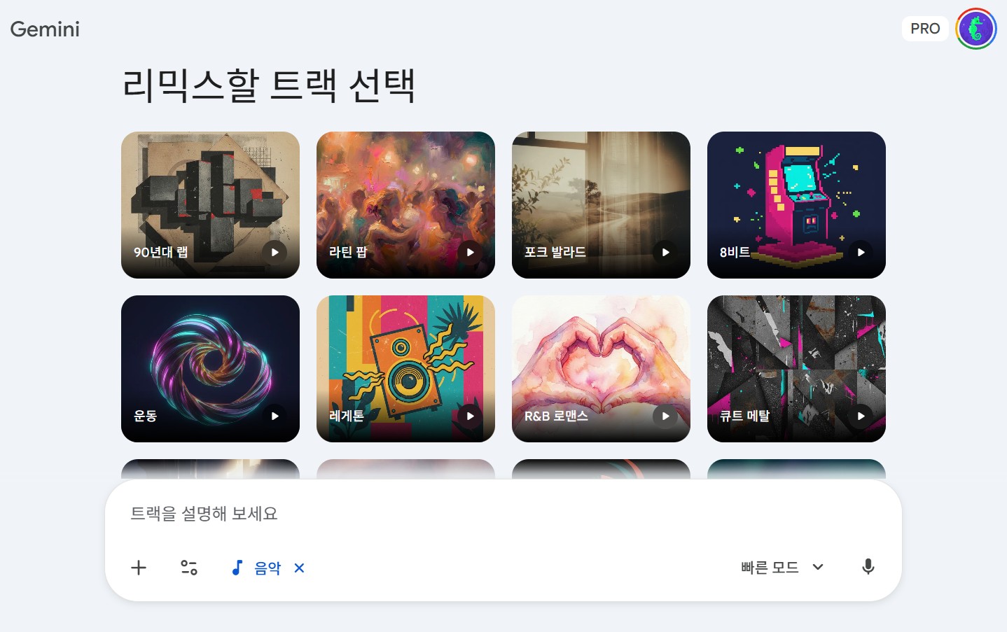 <이미지 : 재미나이의 음악만들기 중 장르선택 화면>