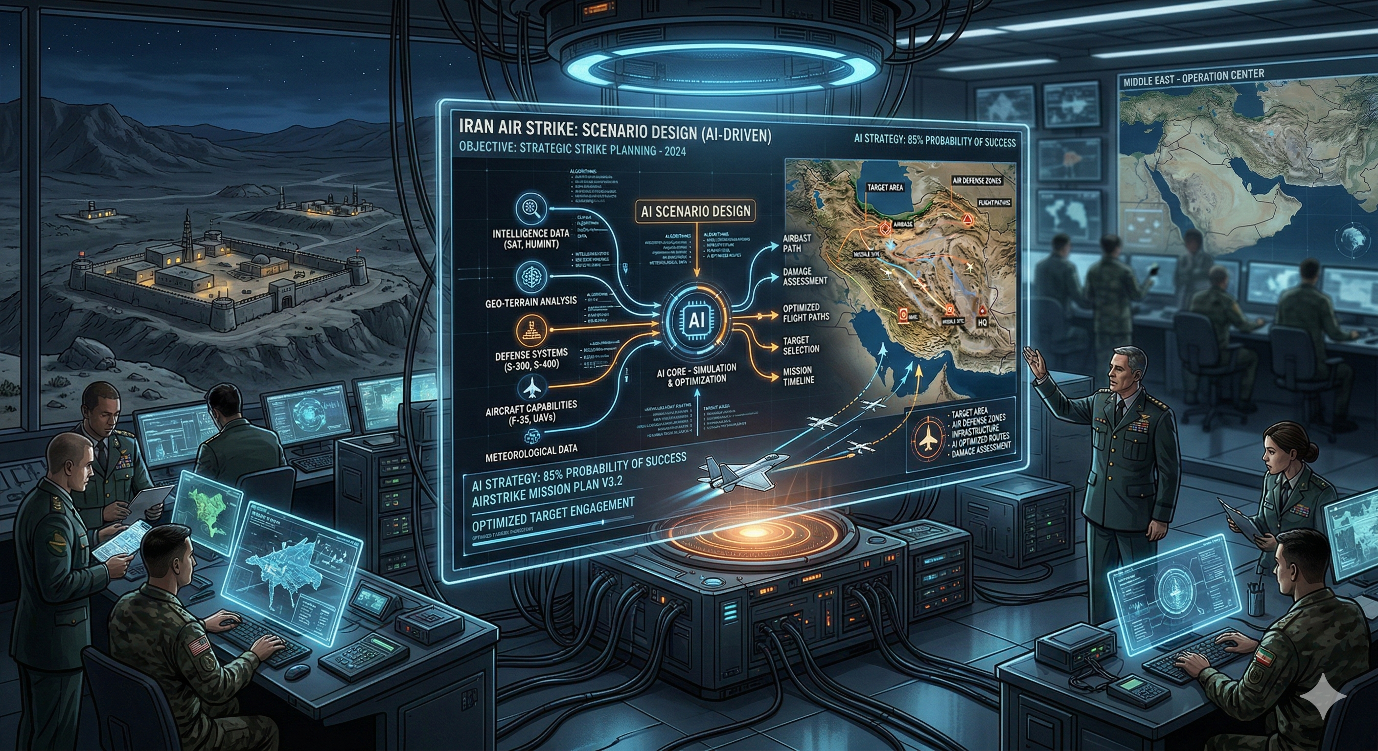 이란 공습에서 AI는 위성 이미지 분석, 미사일 방어 표적 알고리즘, 사이버 위협 탐지, 군수 최적화, 드론 군집 조정, 전장 시뮬레이션, 예측 위협 모델링 등 작전의 거의 모든 영역에 투입되었다. CNN 보도에 따르면 하메네이 최고지도자의 위치를 특정하기 위해 시각정보, 인적정보, 신호정보, 통신 감청, 위성 이미지 등 방대한 데이터가 AI 시스템에 입력되었고, 그 결과물은 14자리 좌표 하나로 출력되었다. 미군 합참의장 댄 케인 대장에 따르면, 트럼프 대통령은 금요일 오후 3시 38분(동부시간) "에픽 퓨리 작전 승인. 중단 없음. 행운을 빈다"는 메시지를 발신했다.