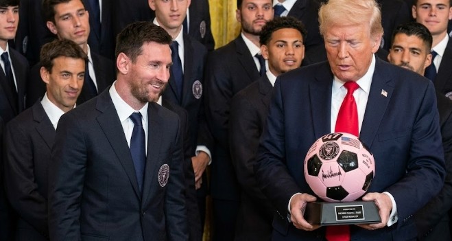3월 5일(현지시간) 미국 워싱턴 백악관 이스트룸. 트럼프 대통령은 2025년 메이저리그사커(MLS) 챔피언 인터 마이애미 CF 선수단을 초청해 우승 축하 행사를 열었다. 행사 시작 전 메시의 모습이 보이지 않아 참석 여부가 주목됐으나, 잠시 후 트럼프 대통령과 나란히 걸어 행사장으로 입장하며 관중의 시선을 집중시켰다. 인터 마이애미 조르지 마스 구단주와 메시는 트럼프에게 기념 유니폼과 사인볼을 전달했다. 메시는 연설 없이 상징적인 공 전달 행사에만 참여했다.